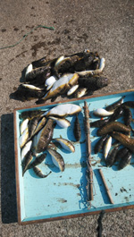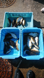 | 小ダイ 16cm〜21cm 75匹 ベラ 18cm〜24cm 110匹くらい メバル 20cm〜23cm 3匹 カサゴ 18cm〜21cm 12匹 ヘダイ 2匹、 キス 1匹、 本ゴチ 1匹、 ハゼ 7匹 |